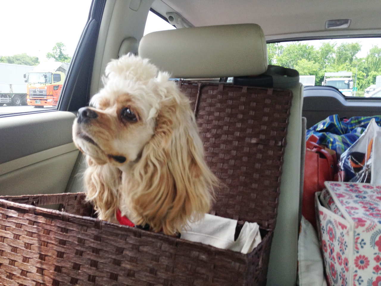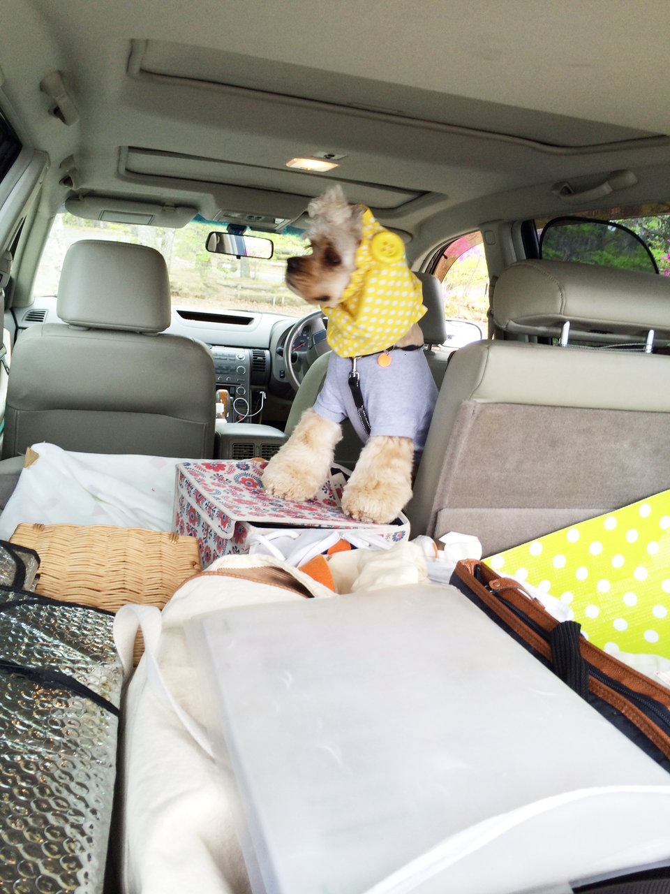 テントの準備中、だいもんは車内で待機です。